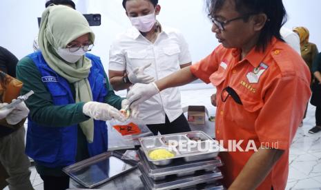 Petugas mengambil sampel makanan yang diduga menjadi penyebab keracunan makan bergizi gratis (MBG) di SPPG Desa Tanggung, Tulungagung, Jawa Timur, Senin (13/10/2025). Data sementara, sedikitnya 43 siswa alami keracunan setelah mengonsumsi makanan program MBG di SMPN 1 Boyolangu dengan gejala mual-muntah disertai pusing, sehingga harus dirawat darurat di fasilitas kesehatan terdekat. (FOTO : ANTARA FOTO/Destyan Sujarwoko)